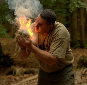 - Light your tinder on the platform and place the two twig bundles cross wise over it, for your first go use a match, you can progress to rubbing sticks together later.
